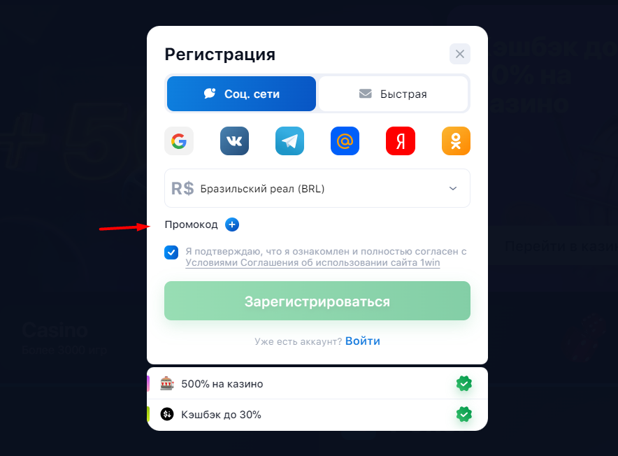 Действующий сегодня промокод 1Вин — ? 1WINGAMES500, дает щедрые подарки за активацию при регистрации или позднее, в отдельном поле профиля. Достаточно вставить комбинацию как есть в окне и нажать Enter.