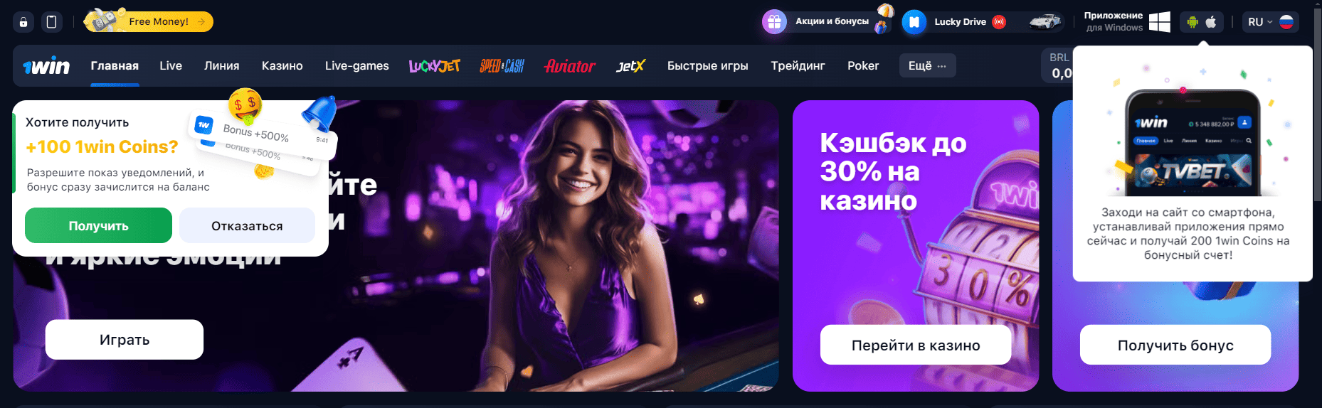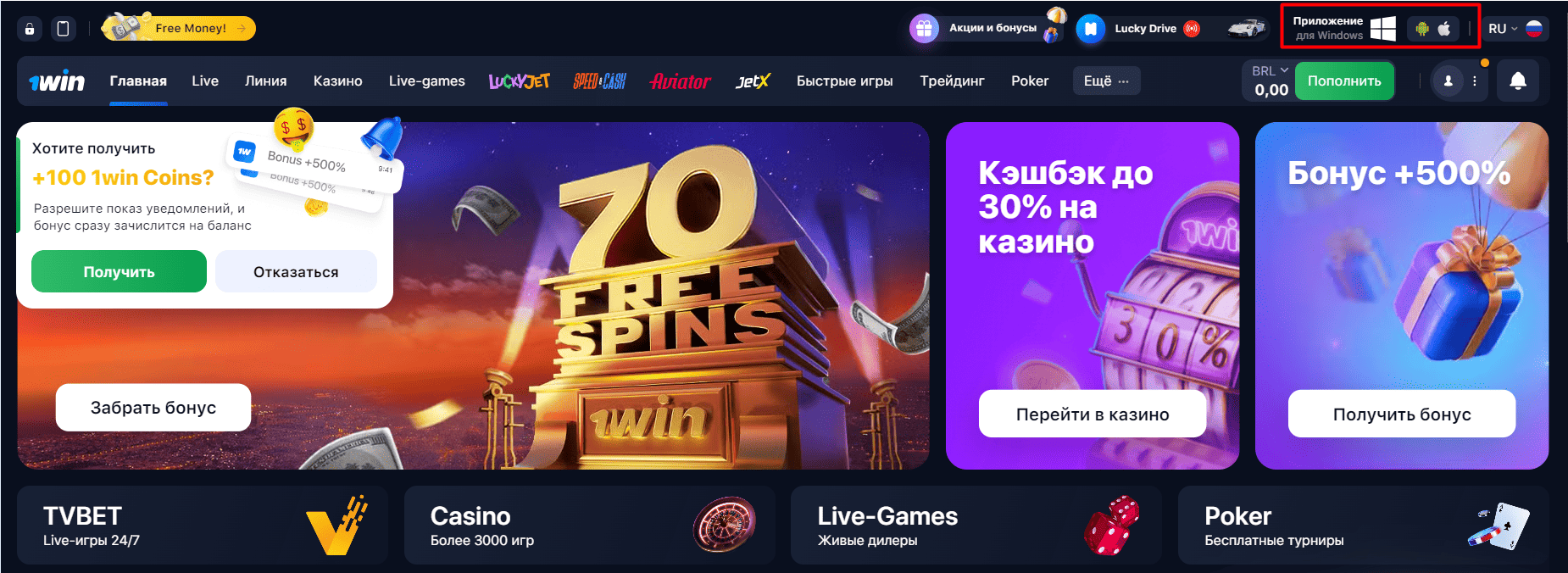 - Открыть 1Win Poker по ссылке через поисковую строку браузера.